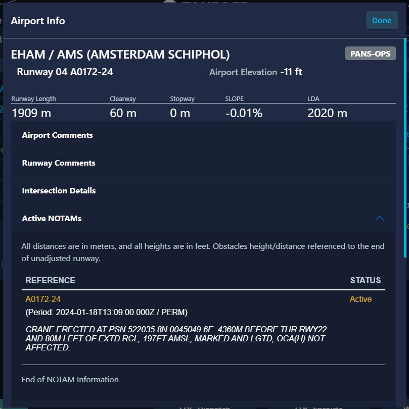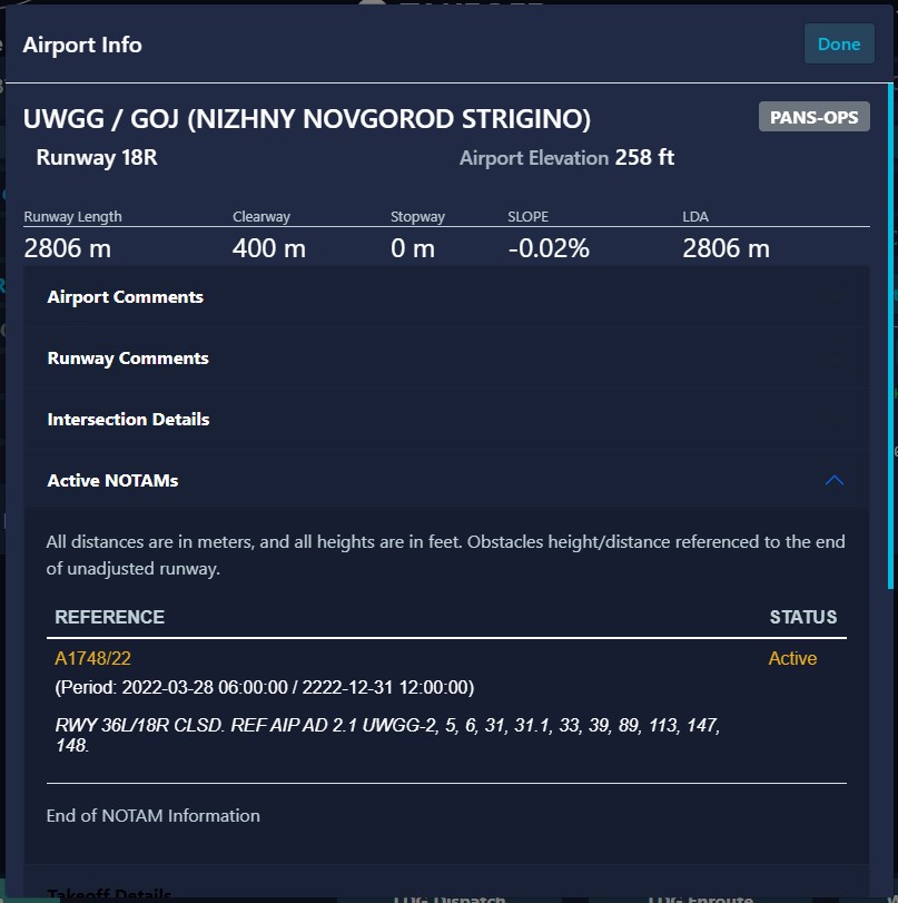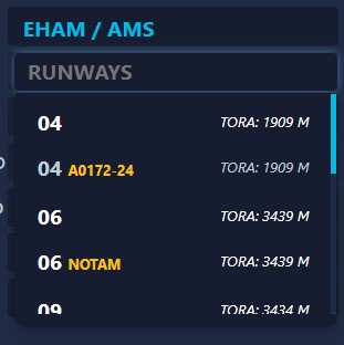 As detailed in our Airport Data section, our airport database receives daily updates containing the latest NOTAMs (Notices to Airmen), SUPs (Supplemental Notices), and more. You can directly observe this in our performance tool when selecting your runway, as you'll be presented with the choice between a runway with NOTAMs or without NOTAMs.