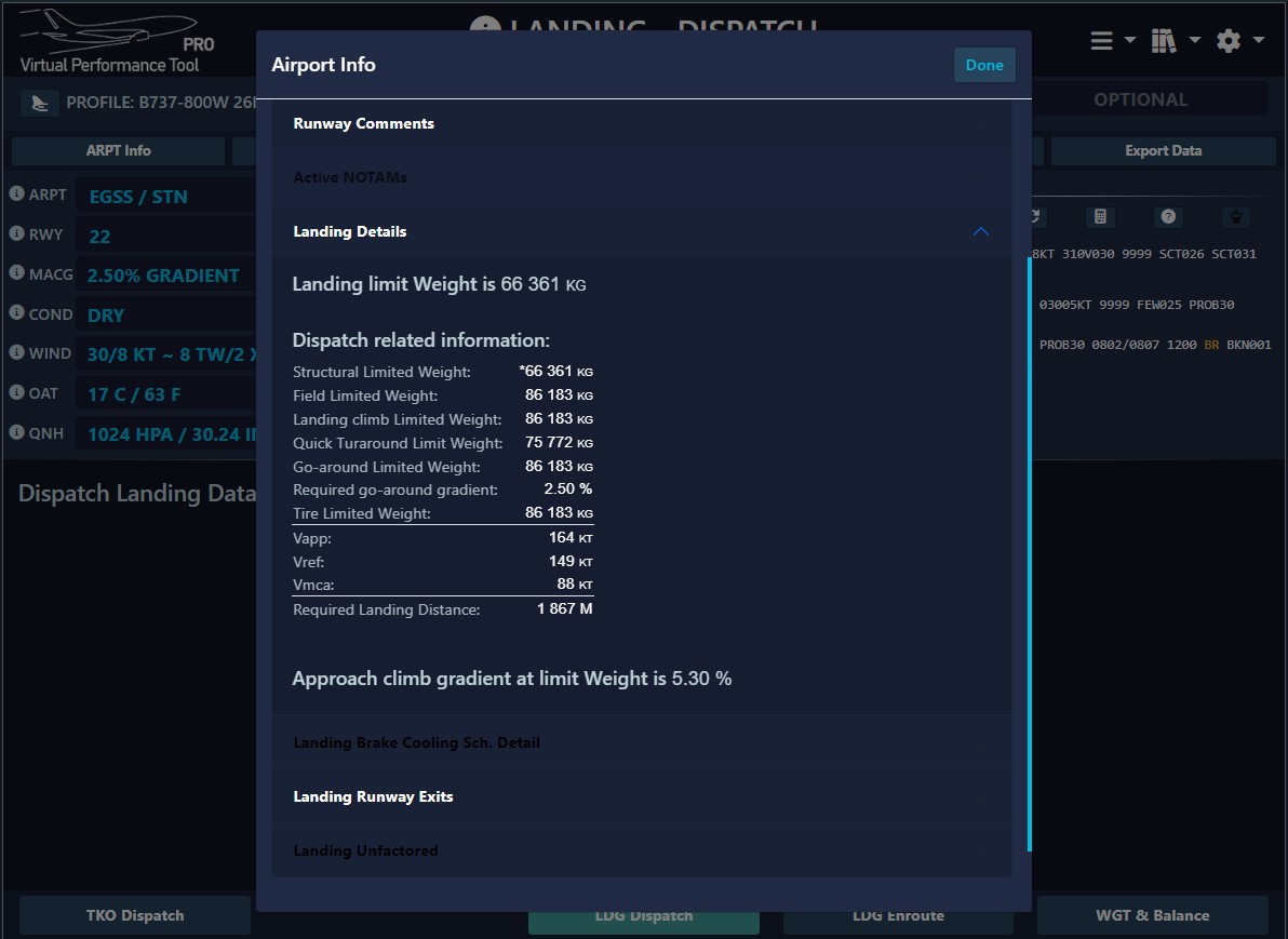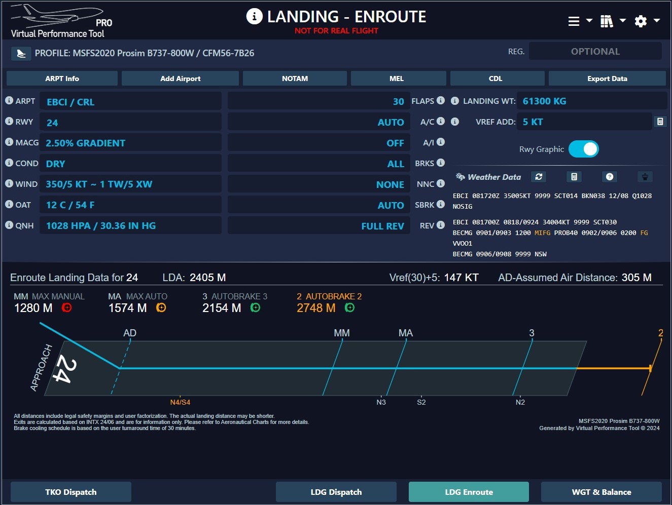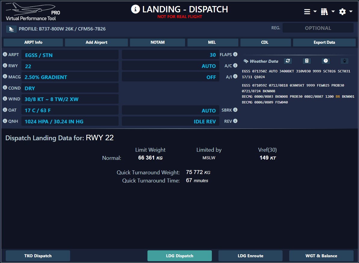 We provide autoland safety increments for models supporting this feature. The landing distance at a given weight is greater for an autoland than a manual landing due to a possible longer flare. A standard value for the 737-800 with Flap 30 configuration is typically set at 185 meters (please note that a different, more precise value may be utilized by our tool).