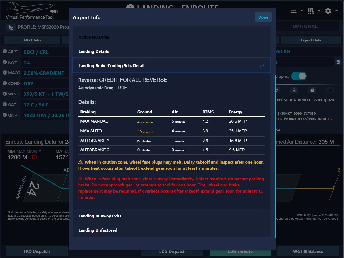 Our tool provides you with both ground and air cooling times, along with the anticipated Brake Temperature Monitoring System (BTMS) value following your landing.
