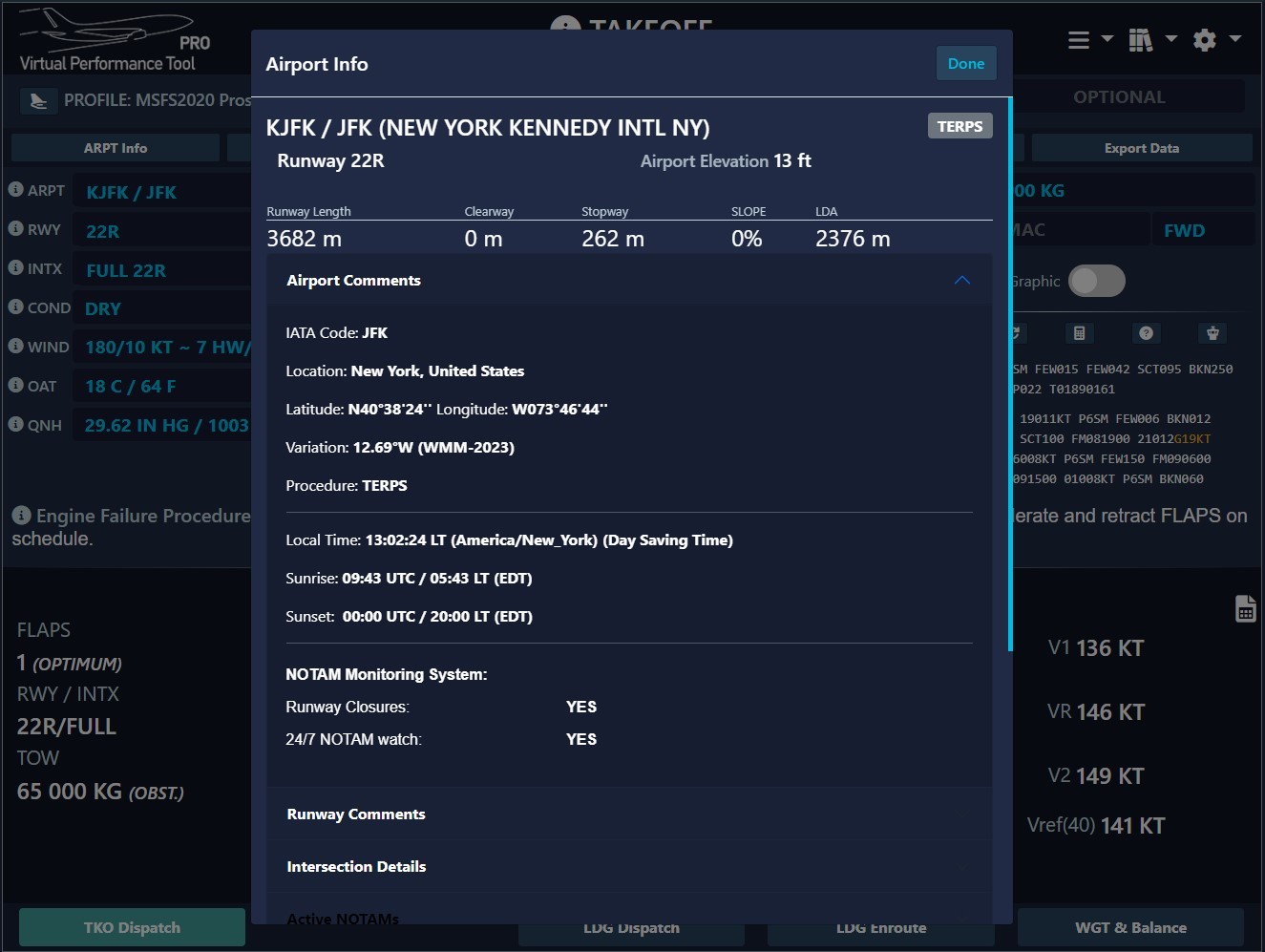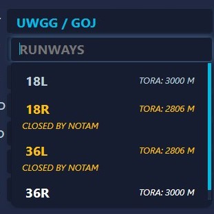 As detailed in our Airport Data section, our airport database receives daily updates containing the latest NOTAMs (Notices to Airmen), SUPs (Supplemental Notices), and more. You can directly observe this in our performance tool when selecting your runway, as you'll be presented with the choice between a runway with NOTAMs or without NOTAMs.