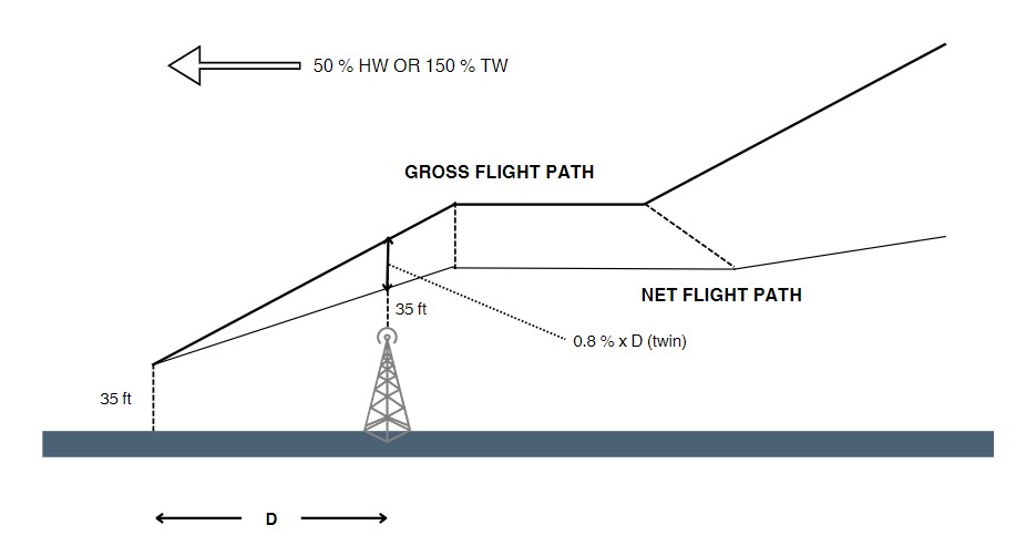 For obstacle clearance, a NET flight path must be taken into account. This trajectory is virtual, achieved by reducing the gross trajectories with a safety margin determined based on the number of engines the aircraft possesses.